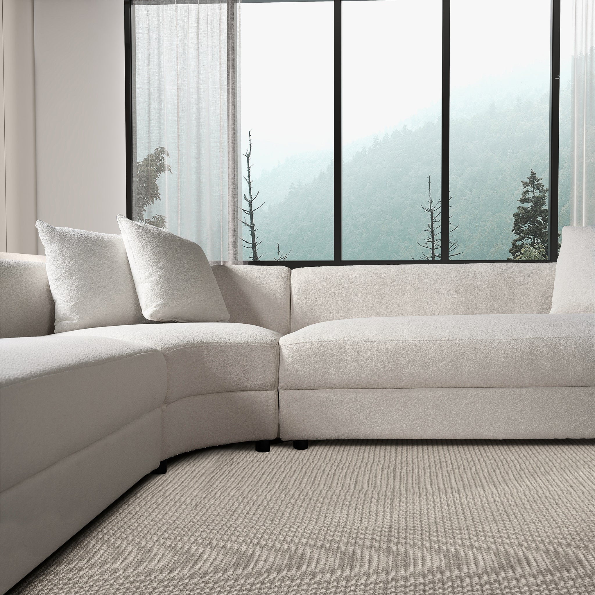 This Japandi mid-century contemporary L-shaped corner sectional couch will completely transform your living area. The sleek spherical profile and symmetrical design offer a sophisticated touch to contemporary living rooms, media rooms, and flats. This sofa, upholstered in warm, wool-like boucle fabric, comfortably seats up to six people. The high-density, high-resiliency foam ensures long-term comfort, while the strong oak frame adds durability and stability. This stain-resistant sofa is simple to clean and keep, combining timeless design with practical usefulness, making it an excellent choice for any home.